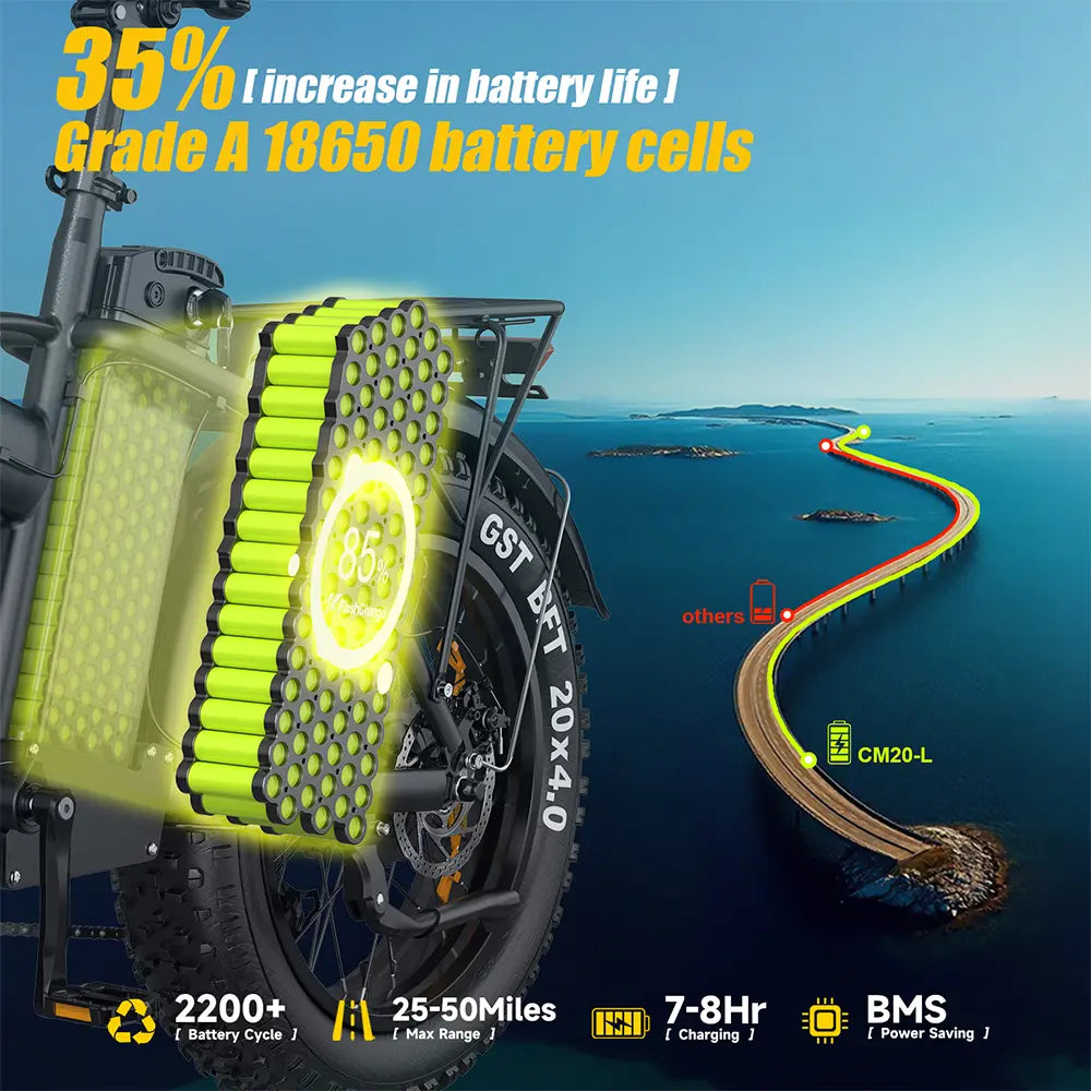 With one full charge for its 648.8Wh battery, CM20 can run up to 25-50 miles.(Pedal Assist)