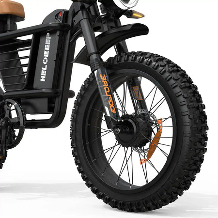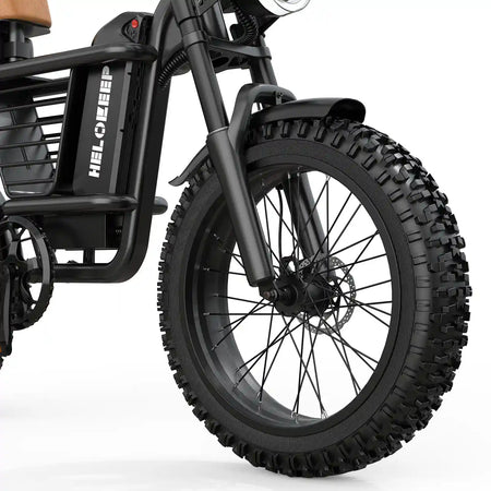 [Off-road Tires]: The HeloKeep e-bike is equipped with 20x4" snow/mud-optimized tires, a weatherproof motor, and adaptive traction for adults seeking unstoppable electric bicycles.
